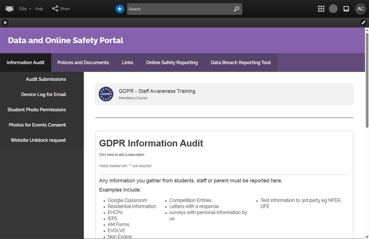 Designed to ensure good practice with regards to GDPR and data security, this portal uses Forms to audit all data stored by any member of staff, has a workflow for reporting data breaches and contains a training presentation to ensure all teachers and school staff understand their responsibilities when using personal information.