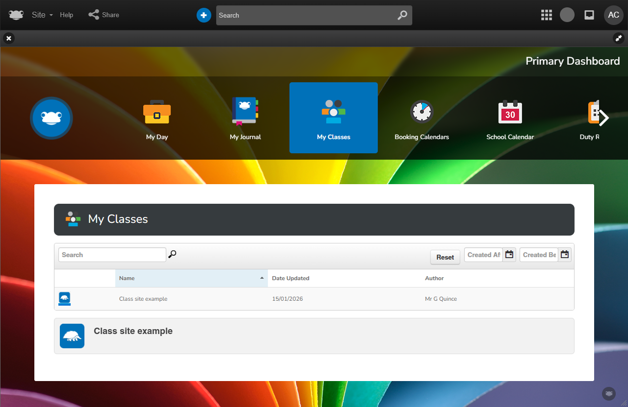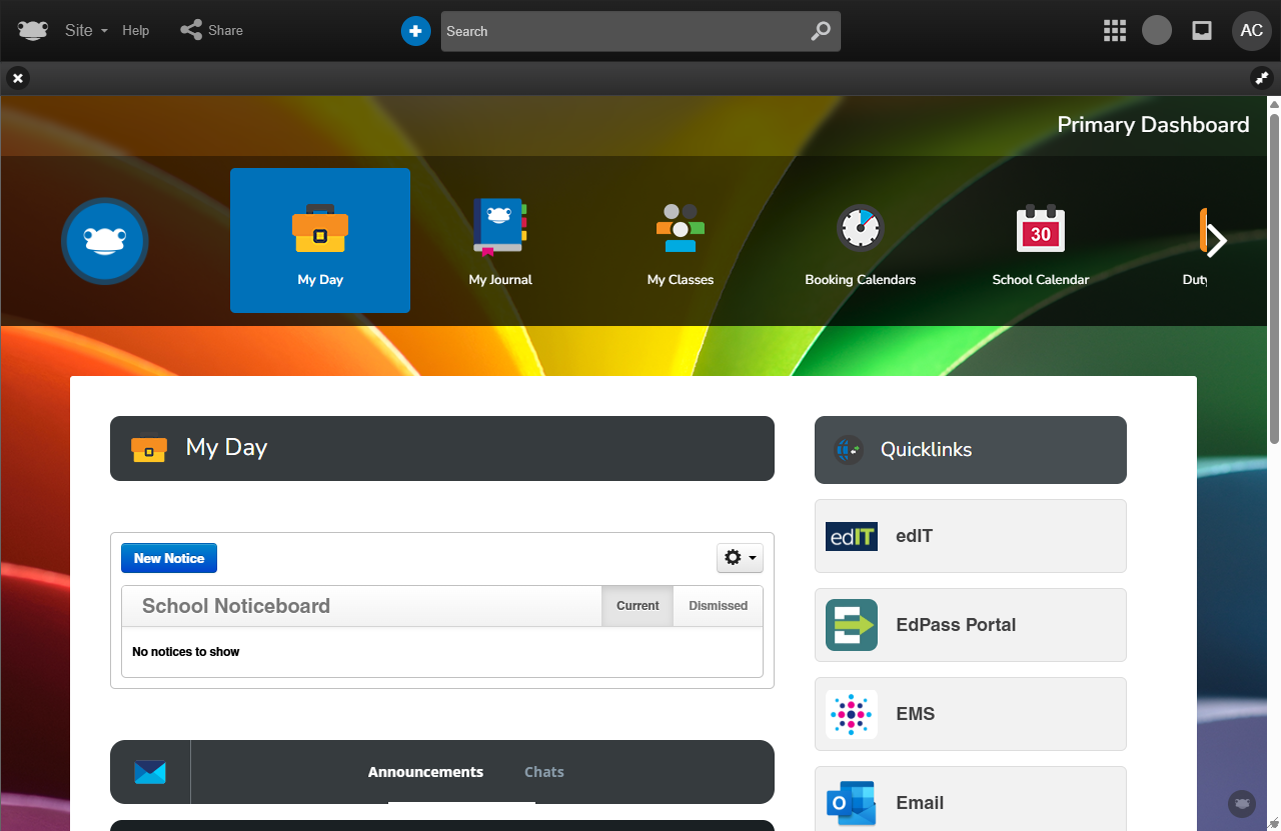 The Staff Primary Dashboard serves as a central workspace for teaching and support staff, bringing together essential systems and information needed throughout the school day.